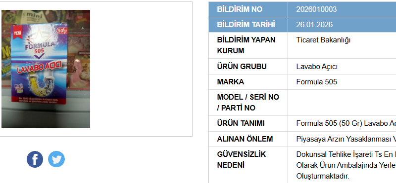 Ticaret Bakanlığı, tüketicilerin can güvenliğini korumak amacıyla denetimlerini sıkılaştırdı. Bakanlık, yaptığı incelemeler sonucunda “Formula 505” markalı lavabo açıcı ürünün güvensiz olduğunu tespit etti. İnsan sağlığını doğrudan tehdit eden bu ürünün Türkiye genelinde satışı tamamen yasaklandı. Bakanlık yetkilileri, ilgili firmanın mevcut tüm stoklarını raflardan çekmesi için talimat verdi.